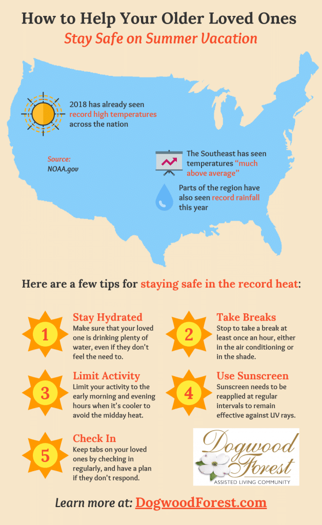 As members of an assisted living community in Atlanta, we have seen the ravages of heat on our senior residents. We would like to share ways you can help your older loved ones stay safe on vacation, especially if they experience heat and humidity they aren’t used to.